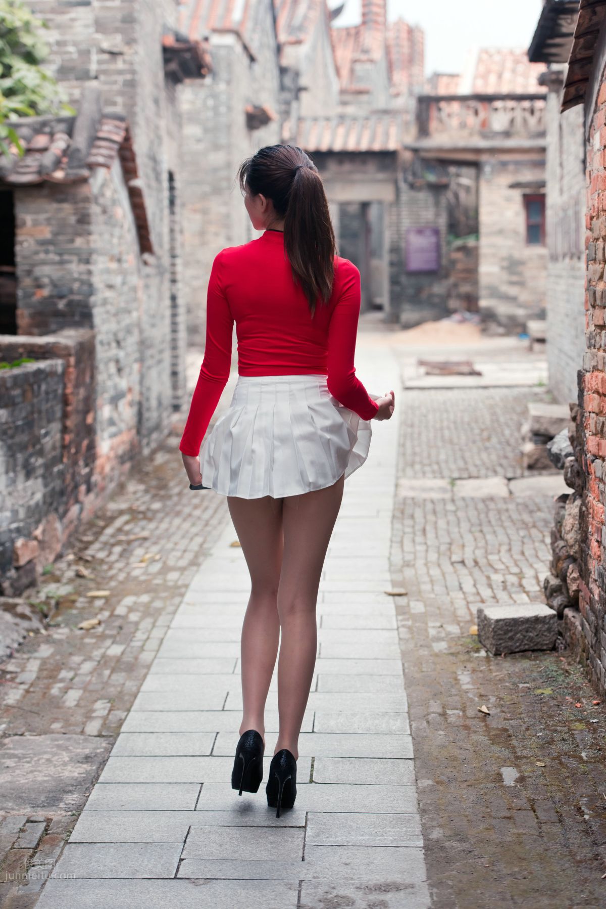 [魔镜街拍] 118 红衣白裙极品丝足美女春光闹古村