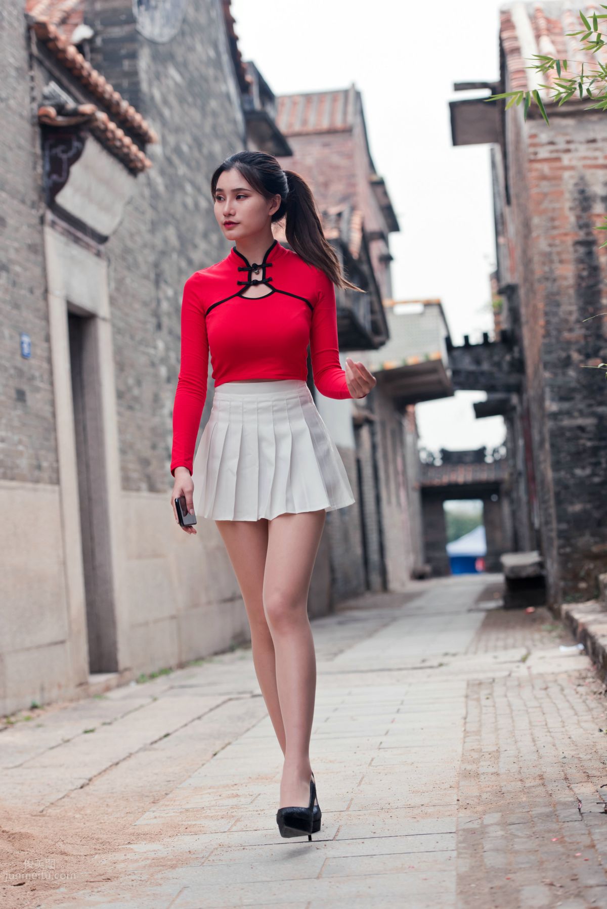 [魔镜街拍] 118 红衣白裙极品丝足美女春光闹古村